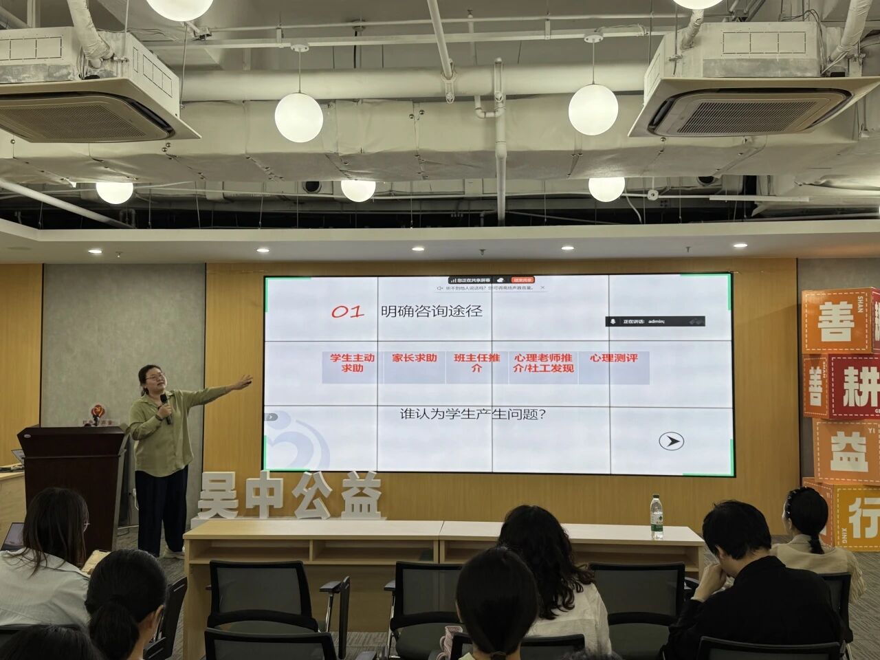 首先,社工简单介绍了苏州中学的基本情况,从学生、教师和课程安排三方面,总结了学校“学业第一”、“活动众多”、“学生自决”的特点。依托学校特点出发,社工以“心理剧小组”为例,详细讲述了如何将学校社工服务嵌入原有教学活动体系;再以“志愿服务小组”为例,说明了结合学生实际需求的嵌入式服务的具体开展模式。最后,社工表明,学校社工服务的开展需要充分了解学校与学生实际情况与需求,结合学校特色,在不影响不干扰的前提下,充分发挥个人魅力,实现支持、陪伴、教育、链接等功能,探索更多服务可能。