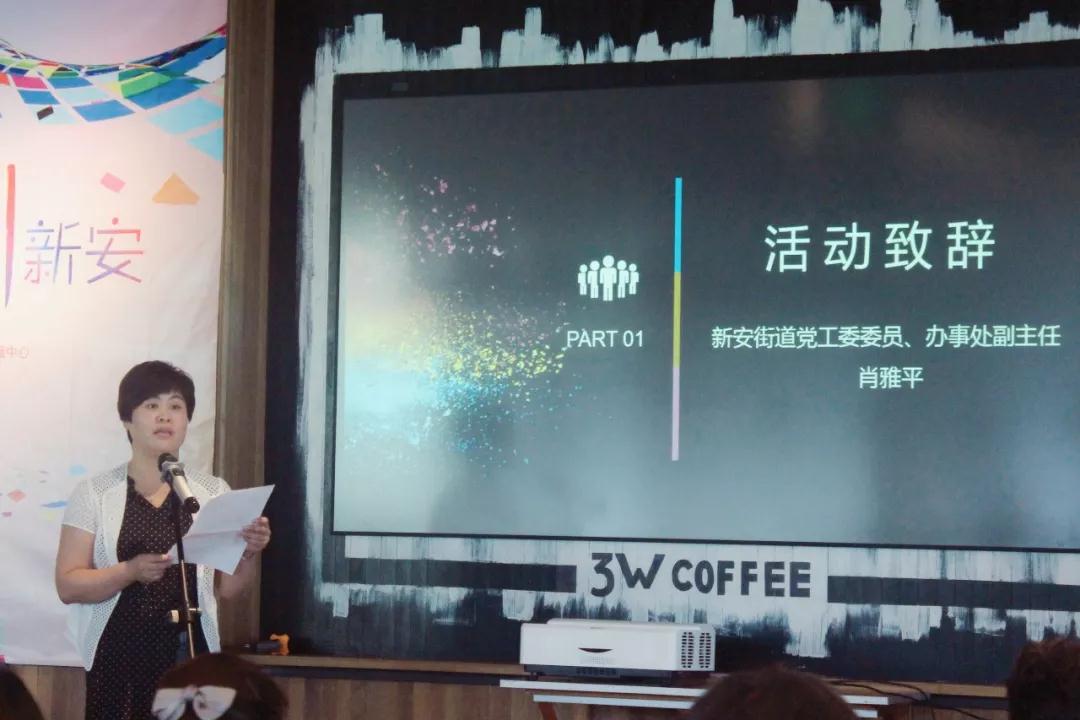 活动开始, 新安街道党工委委员、办事处副主任肖雅平为本次活动致辞。肖主任回顾了今年上半年以来,新安街道在创新基层治理与服务,推动 “四社联动”建设方面所做工作和取得的成效,并对发挥本次公益服务对接会的平台作用、推动社区和社会组织资源的共通互惠的美好愿景,提出了三点希望。