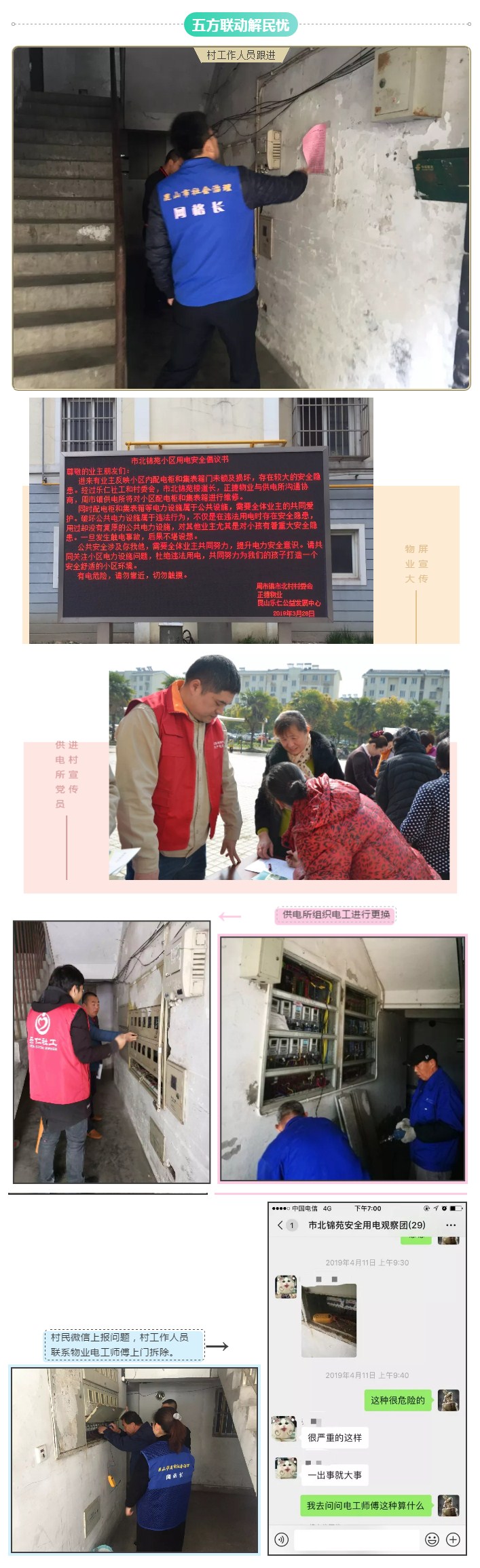 对接供电所,协商小区公共电力设施更换,邀请供电所党员进小区进行用电安全动员宣传;搭建村民用电安全线上沟通平台,实时监测小区电力安全,对接物业进行问题处理,为小区住户提供安全、温馨的居住环境。