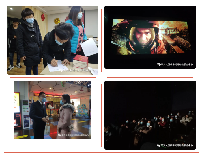 进企业走访慰问后,各下沉党员、辖区共建企业党员、平安大厦各商户党员和社区党委成员约30人,共同前往平安大厦7楼横店影城观看《紧急救援》电影。本次党建带群团建设活动,不仅增强了各党员间的联系,同时将多方力量资源联动起来,助力商圈党建工作稳步推进。