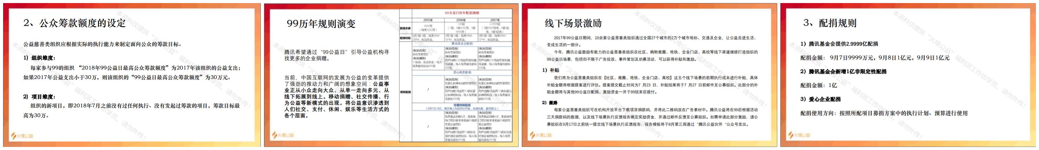 接着刘老师介绍了2018年99公益日具体规则,包括组织(或项目)准入规则、公众筹款额度的设定、配捐规则、线下场景激励及99历年规则演变。